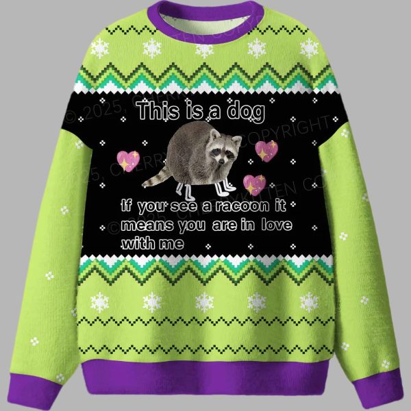 This spectacularly confident and humorous sweater is a standout star in the ugly Christmas sweater tradition, designed for those who appreciate absurdity and have high self-esteem. The captivating center graphic features a highly detailed raccoon, cleverly mislabeled as “This is a dog” in the top text. The bottom text then delivers the punchline and the central message: “If you see a raccoon it means you are in love with me,” with floating pink hearts adding a touch of ironic romance. The entire scene is set against a neon lime green and black background, framed by vibrant green and white chevron-style borders and scattered snowflakes. This garment is far more than just holiday apparel; it’s a brilliant, humorous symbol of irreverent self-confidence, internet humor, and playful arrogance. It’s an ideal way to showcase your witty, unique personality and inject some unforgettable, laugh-out-loud style into any Christmas gathering, proving that even a trash panda can be a source of profound emotion.